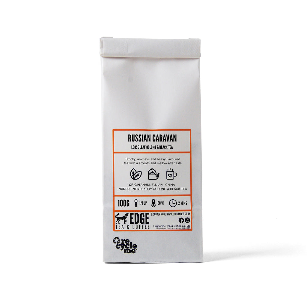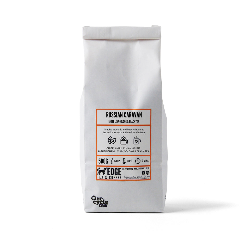 Russian Caravan is a blend of Oolong, Keemun and Lapsang Souchong teas. Although a blend of China teas, the name Russian Caravan comes from the 18th century camel caravans that brought China tea to Europe. An aromatic and full bodied tea with a smoky taste.