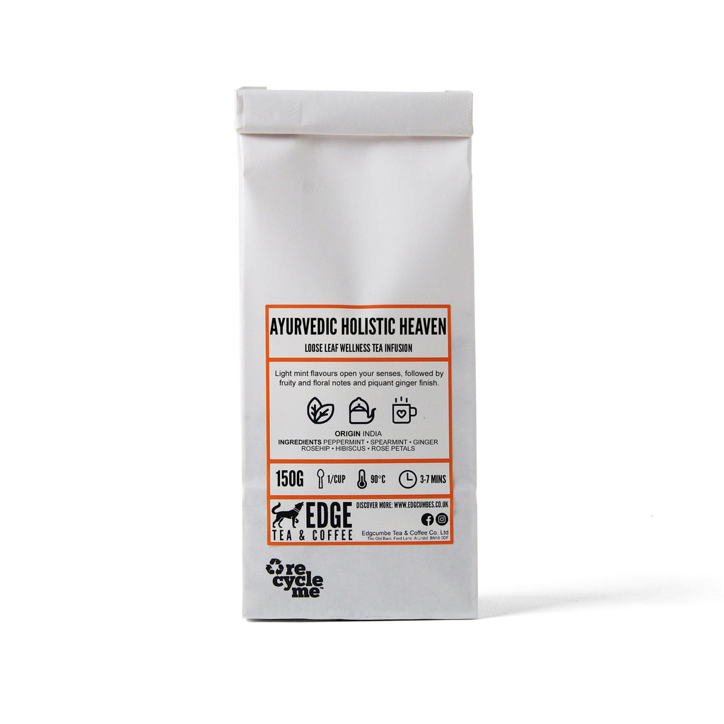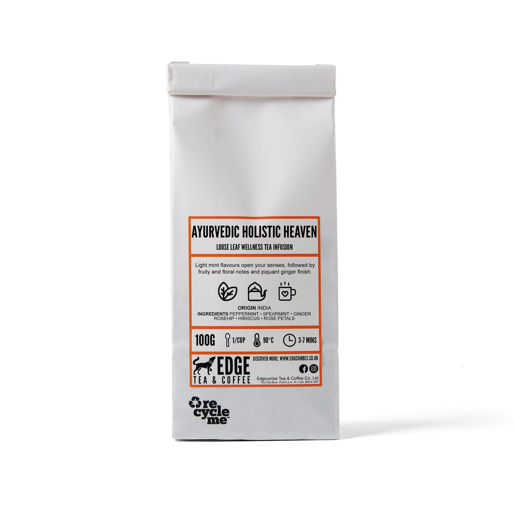 Discover balance and vitality with our Ayurvedic Tea, inspired by ancient Indian wellness traditions. This caffeine-free blend is rich in antioxidants and crafted with 1st Grade Melange quality, offering a soothing, flavourful experience. Featuring luxurious ingredients like Peppermint, Spearmint, Ginger, Osmanthus, Hibiscus, Rooibos, and Rosehip, it delivers a harmonious blend of floral and fruity notes with a naturally sweet finish. Blended and packed in Canada, this tea embodies the essence of Ayurveda – promoting harmony of body and mind. Perfect for relaxation and rejuvenation.