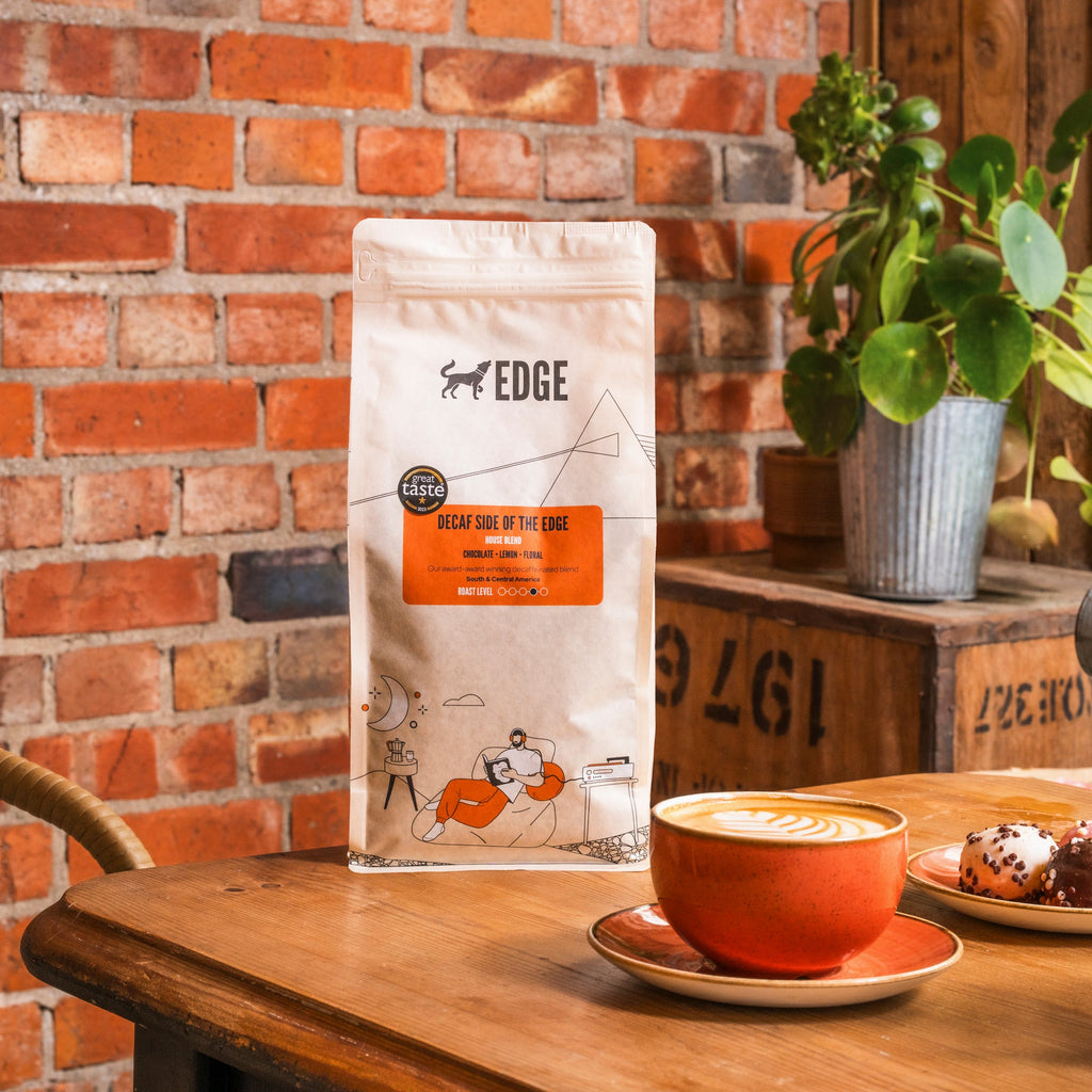 Our first decaffeinated blend – proving popular in the EDGE Café we decided to make this available for our customers to be able to brew and enjoy at home! A blend of both our single origin decafs, Mexico Mountain Water and our popular Brazilian Swiss Water, our decaf blend is 99.9% caffeine free using water processes.